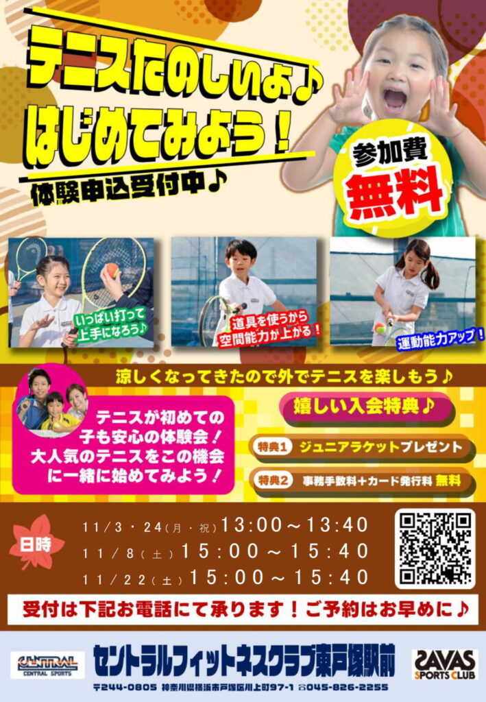 ジュニアテニスはじめて体験会。ラケットとボールを使い遊びながらミニラリー、ミニゲームを楽しみましょう! 2025.09.01 お知らせ セントラルフィットネスクラブ 東戸塚駅前校では、体験レッスン・見学をお待ちしております! ぜひお気軽にお問い合わせください。 お申込みはこちら! 体験レッスン受付中|初心者大歓迎♪一緒にテニスを始めましょう! 11月横浜エリアジュニア合同イベントのお知らせ 一覧へ戻る
