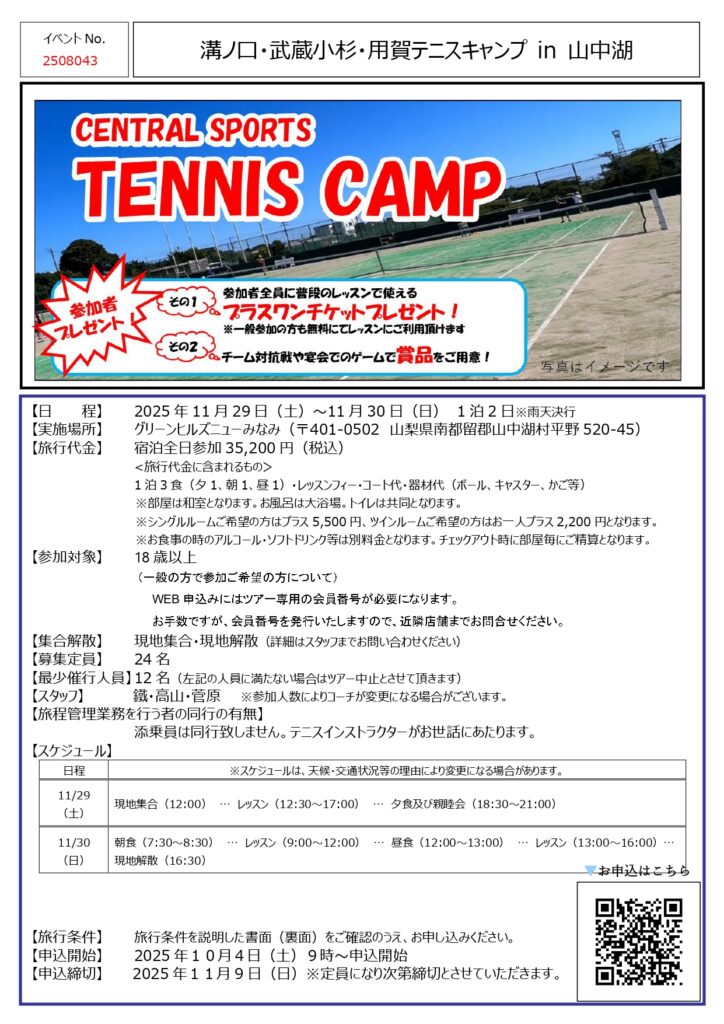 11月セントラル全体イベントのお知らせ 2025.09.24 お知らせ 11月には、ジュニアA・B・Cの合同練習会 in 千葉白子、成人テニスキャンプin山梨山中湖が開催です!スポーツの秋、この機会に皆様のご参加をお待ちしております♪ お申し込みは、各要項をご確認の上お願い致します。 体験レッスン受付中!初心者大歓迎♪一緒にテニスを始めましょう! 一覧へ戻る