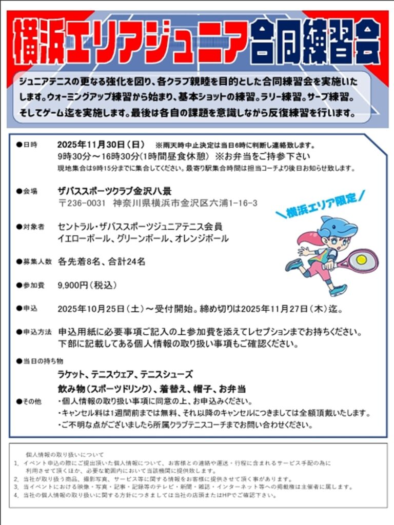 11月横浜エリアジュニア合同練習会のお知らせ 2025.08.02 お知らせ 11月30日(日)に横浜エリアのジュニア合同練習会を開催します!スポーツの秋、この機会に皆様のご参加をお待ちしております♪ お申し込みはレセプションにてお願い致します。 体験レッスン受付中|初心者大歓迎♪一緒にテニスを始めましょう! 一覧へ戻る