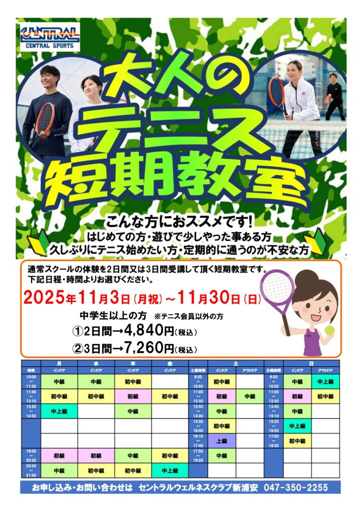 テニスをやってみよう!大人の短期教室受付中! 2025.10.24 お知らせ 短期教室へのご参加は通常体験よりお申込みください イベントレッスンのお知らせ♪ 体験レッスン受付中|初心者大歓迎♪一緒にテニスを始めましょう! 一覧へ戻る