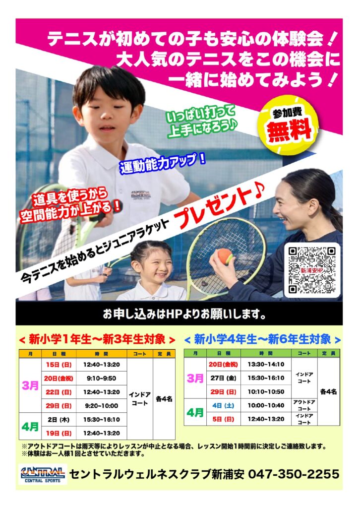セントラルウェルネスクラブ新浦安では小学生向けに、テニスをお気軽に体験できるお気軽体験会を実施しています。