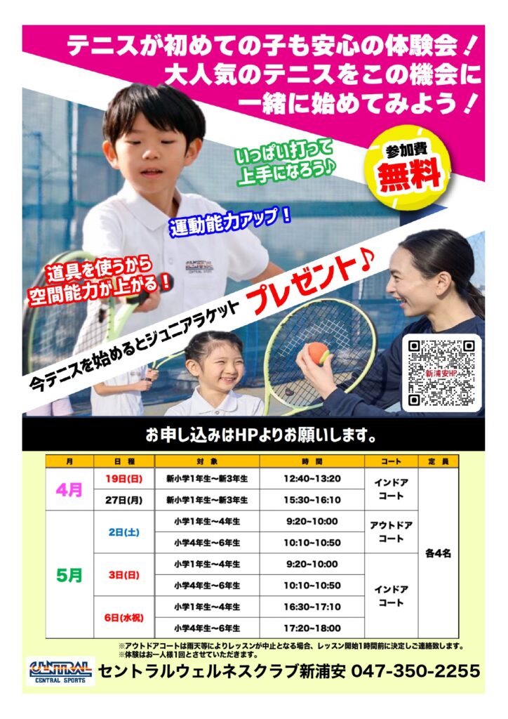 セントラルウェルネスクラブ新浦安では小学生向けに、テニスをお気軽に体験できるお気軽体験会を実施しています。
