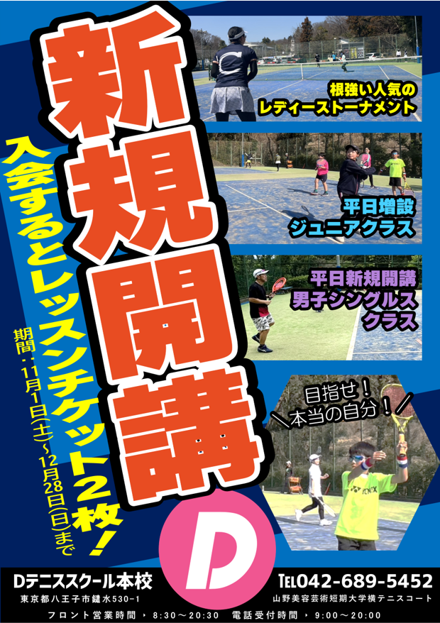11月・12月入会キャンペーン|新設クラス開講! 2025.11.22 キャンペーン 11月より新設クラスが開講します! ・根強い人気のレディースクラス! ・平日ジュニアクラスの増設! ・平日男性クラス開講! 新たなコーチも加わり、今まで以上に活気に満ちたD-tennis本校に是非体験に来てください! 体験お申し込みはこちらから 戸吹大会情報(12月・1月) 一覧へ戻る