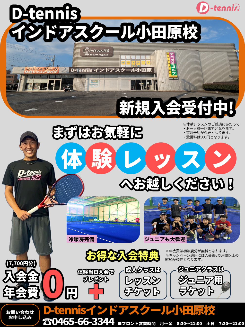 体験レッスン受付中|初心者大歓迎♪一緒にテニスを始めましょう! 2025.12.01 お知らせ Dテニスインドアスクール小田原校では、体験レッスン・見学をお待ちしております! ぜひお気軽にお問い合わせください。 体験レッスンのお問い合わせはこちらから 体験レッスン受付中|初心者大歓迎♪一緒にゴルフを始めましょう! ゴルフ無料体験フェア 一覧へ戻る