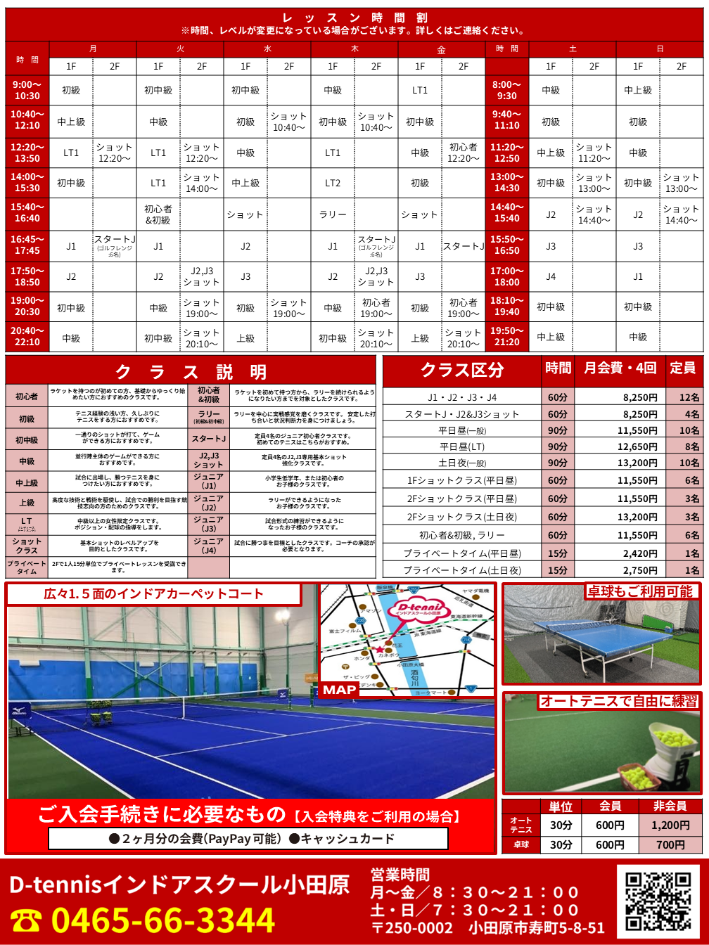 体験レッスン受付中|初心者大歓迎♪一緒にテニスを始めましょう! 2025.12.01 お知らせ Dテニスインドアスクール小田原校では、体験レッスン・見学をお待ちしております! ぜひお気軽にお問い合わせください。 体験レッスンのお問い合わせはこちらから 体験レッスン受付中|初心者大歓迎♪一緒にゴルフを始めましょう! 2026年 新春お年玉キャンペーンのお知らせ 一覧へ戻る