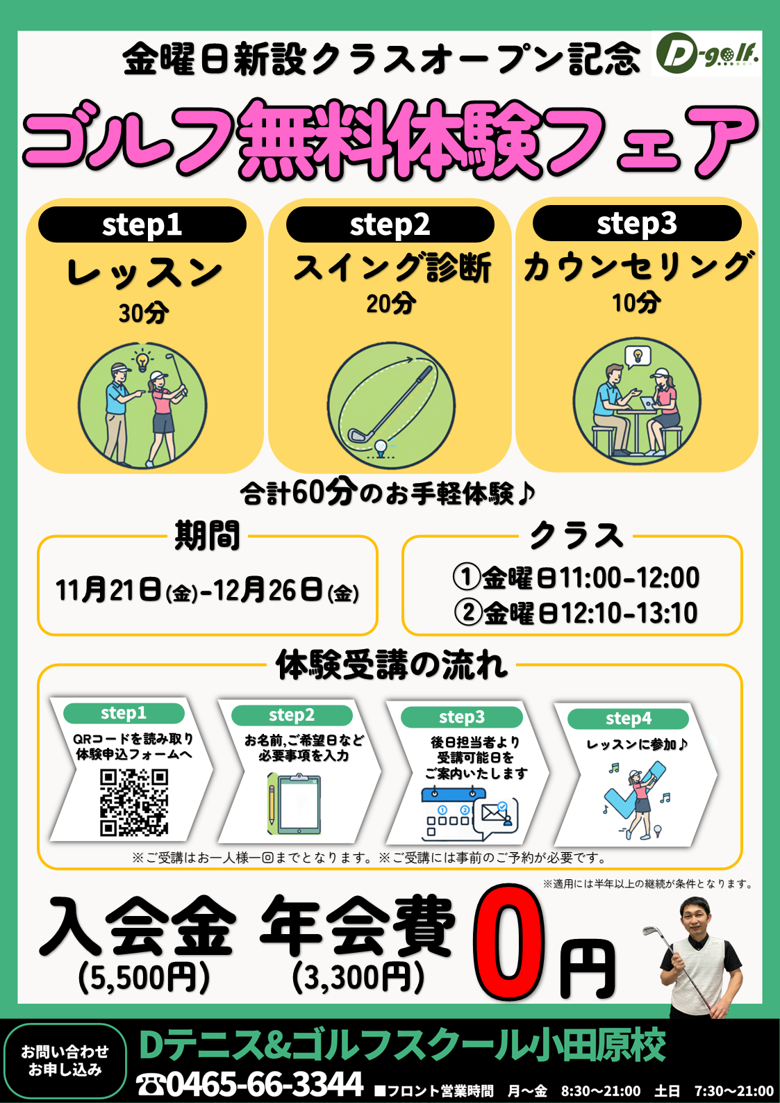 この度、金曜午前クラスのオープンを記念して、ゴルフ無料体験フェアを開催いたします。