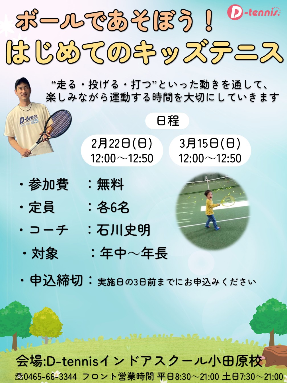 D-tennisインドアスクール小田原校では、未就学児(年中〜年長)を対象とした無料体験イベントを開催します。