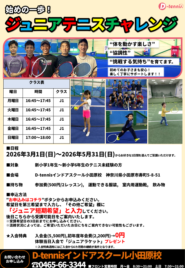 2026年3月1日(日)~2026年5月31日(日)まで、ジュニア向けの短期教室「はじめの一歩!ジュニアテニスチャレンジ」を開催いたします!