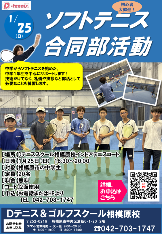 1月25日(日)ソフトテニス合同部活動 2025.12.21 お知らせ 1月25日(日)にソフトテニス合同部活動を実施いたします。 相模原市のソフトテニス部の中学生の方が対象です。 インドアなので必ず実施できます! 中学校の枠を越えて皆で練習しましょう! お申込みはこちらから ピックルボール 10月より日曜日クラス新設! 2026年1月無料体験会のお知らせ 一覧へ戻る