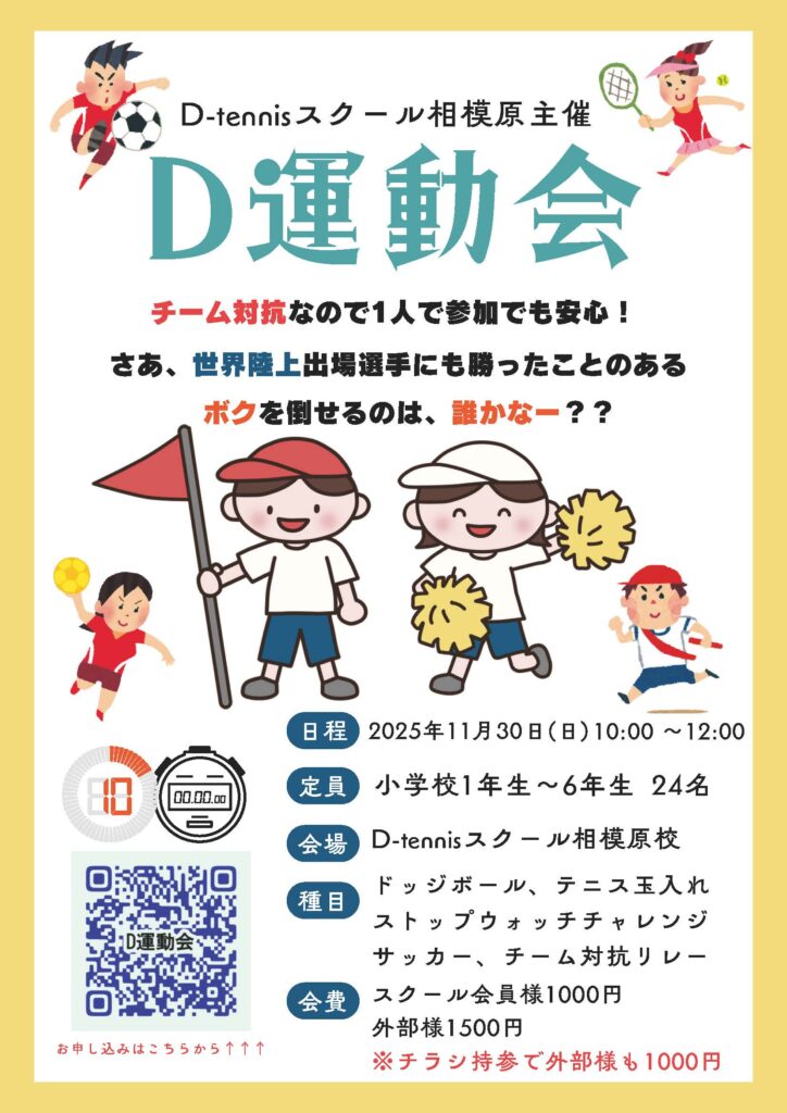 11月30日(日) D運動会開催! 2025.11.02 お知らせ 11月30日(日)にD運動会を実施いたします。 みんな集まれ!D運動会で盛り上がろう!やっぱり運動会は年に1回だけでは物足りない! Dテニススクールのコートを駆け回り、友達と最高の思い出を作ろう! お申込みはこちらから 11月23日(日)ソフトテニス合同部活動 一覧へ戻る