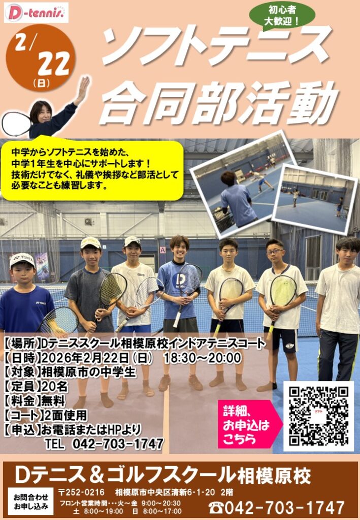 2月22日(日)ソフトテニス合同部活動 2026.02.05 お知らせ 2月22日(日)に大好評のソフトテニス合同部活動を開催いたします。 中学校のソフトテニス部の参加お待ちしております。 2月23日(月・祝)イベントデー 一覧へ戻る