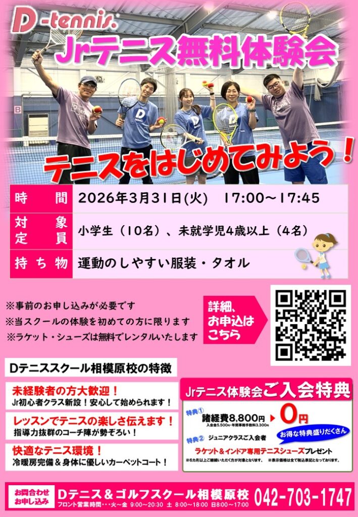 ジュニア無料体験会 2026.03.10 お知らせ 3月31日(火)に小学生と未就学児対象の無料テニス体験会を行います。 新年度に向けてテニスを始めてみませんか? まずは体験してみましょう! 皆様のご参加お待ちしております。 3月29日(日)・31日(火)イベントデー 3月29日(日)成人クラス無料テニス体験会 一覧へ戻る