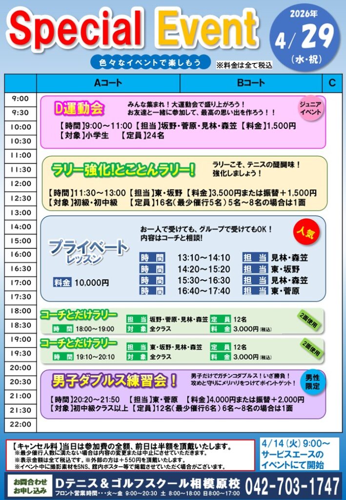 4月29日(水・祝)イベントのお知らせ 2026.04.11 お知らせ 4月29日(水・祝)、30日(木)は通常レッスンはお休みです。 29日(水・祝)はイベントを行います。 今回も内容盛りだくさん! 4月14日(火)9:00よりお申込み開始です。 皆様のご参加お待ちしております。 ジュニアはじめてクラス新設 一覧へ戻る