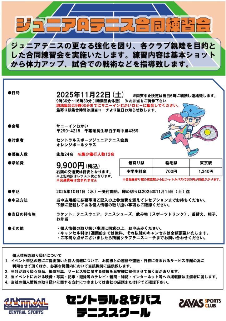 11月セントラル全体イベントのお知らせ 2025.10.13 お知らせ 11月には、ジュニアA・Bの合同練習会 in 千葉白子が開催決定です!スポーツの秋、この機会に皆様のご参加をお待ちしております♪ お申し込みはレセプションにてお願い致します。 秋の特得紹介キャンペーン! 小学生向けイベント!テニスお気軽体験会実施中 一覧へ戻る