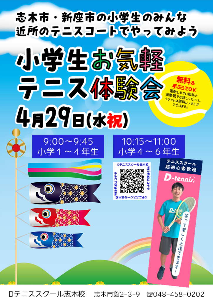 Dテニススクール志木校では、テニスを気軽に体験できるお気軽体験会を実施しています。