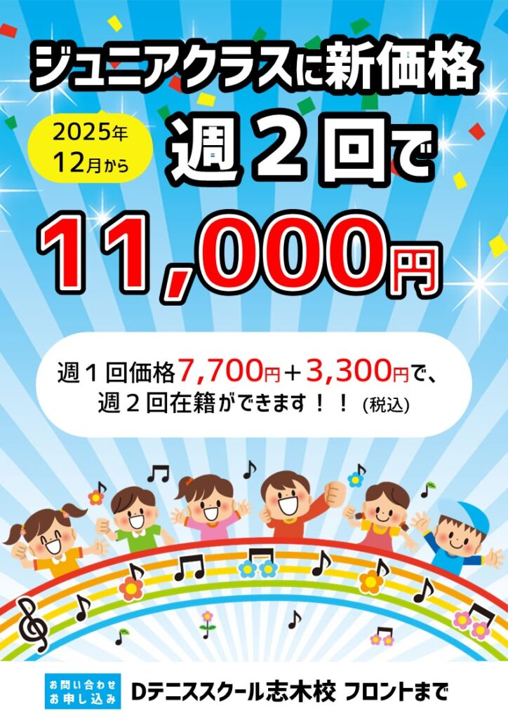 ジュニア週2回コース1ヶ月13,200円が、12月から地域1番家計に優しい価格の11,000円になります。
