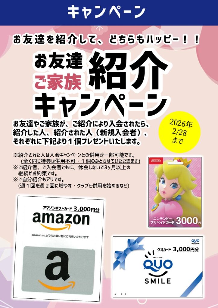 ご自身の回数を増やす、お友達に紹介する、両方とも紹介キャンペーンが適用されます!!